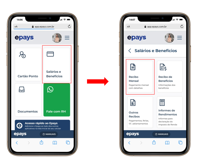 Na tela inicial do Epays, acesse o menu “Salário e Benefícios” e clique em “Recibo Mensal”.