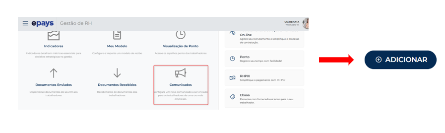 Para realizar o envio acesse o menu Comunicados, clique na opção “Adicionar”.