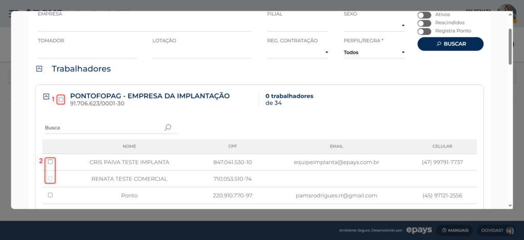Ao clicar em adicionar, irá abrir a tela para selecionar a empresa (1) ou os trabalhadores (2).