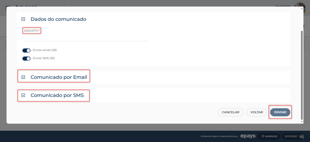 Na próxima tela adicione o Assunto, desça a tela e preencha com as informações necessárias para o envio por e-mail ou SMS e salva.