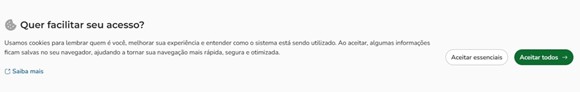 • Aceitar essenciais: Inclui apenas o necessário, como autenticação, logs e sessão de 12 horas (caso não marque “Manter Conectado”).