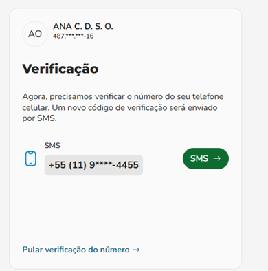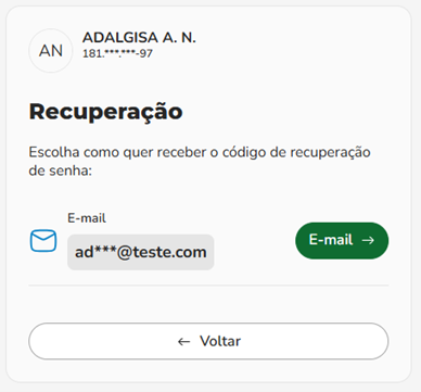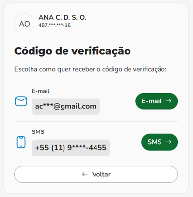 O sistema exibirá os contatos (e-mail e/ou celular) já existentes, de forma parcialmente oculta, para que você escolha o meio de recebimento do código de verificação (SMS ou E-mail).