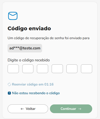 Após selecionar a forma de recuperação (e-mail ou SMS), o sistema enviará automaticamente um código de 6 dígitos numéricos.
