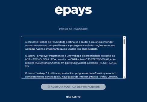 Sendo o primeiro acesso ao Epays, será necessário aceitar as Políticas de Privacidade, rolando a barra até o final para habilitar o botão de aceite: