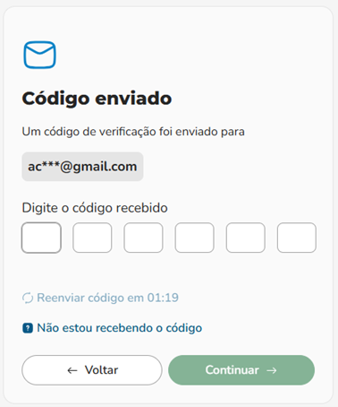 Após 1 minuto e 30 segundos, será possível “Reenviar Código”, caso ainda não tenha recebido. Cada reenvio gera um novo código, invalidando o anterior.