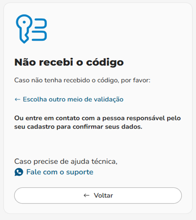 Se o código não for recebido, haverá uma opção de ajuda para tentar outro meio de verificação ou acionar o Canal de Suporte.